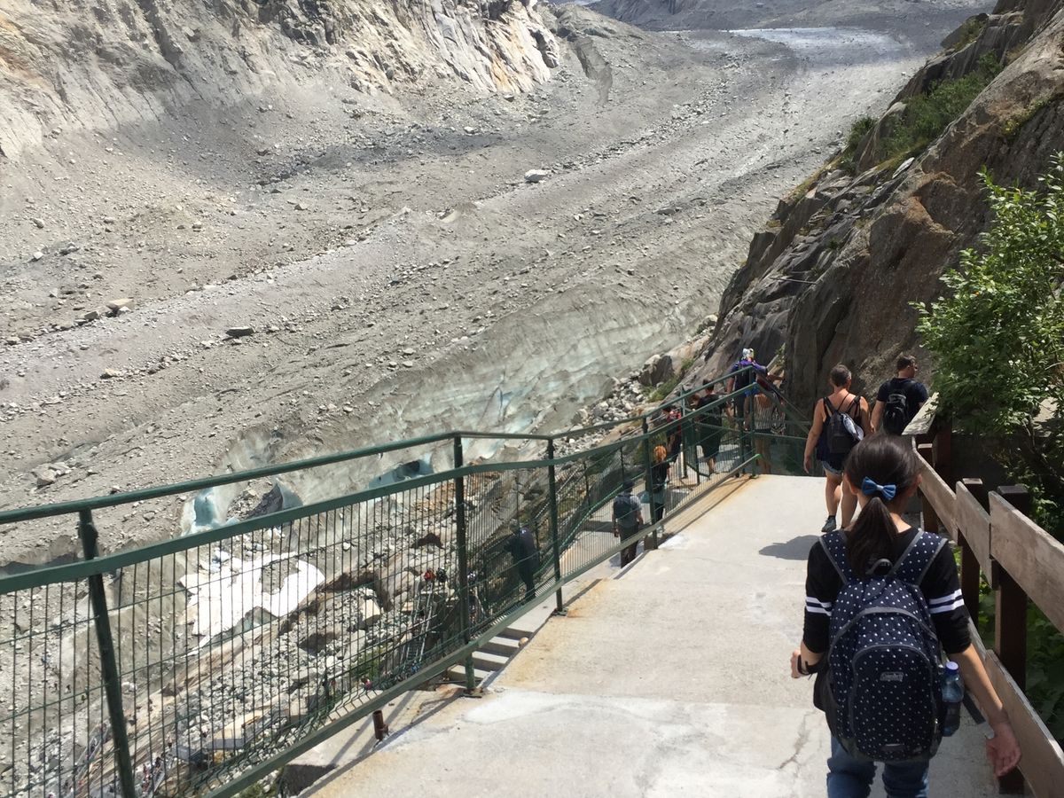 モンタンヴェール鉄道を使って氷河の近くまでがんばって階段を下りていきました。がんばったかいがあり、青い氷の氷河を間近で見ることができ、氷河か崩れるおとも聞いたのは感動はありました。
