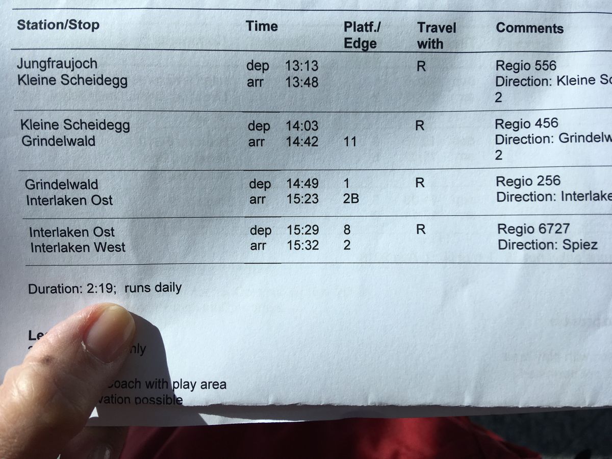 ユングフラウ鉄道はこのレイルパスを見せるだけでそのまま乗れました(ただし、ホームで並ぶ時は予約ナシの方に並びます)。車掌さんがパスの右側に書いてあるJungfrauをペンで消して日付を書いていました。