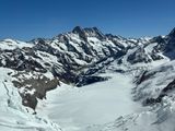 最後エレベーターを昇ってプラトーに到着。雪の坂を少し上っていくのですが、スニーカーでは間違いなく転びますw。たったこの時のためだけにですが、スニーカーに取り付けるスノースパイクを購入して持参してよかったです。海外の方も結構使っていました。食事は一番下の階にテーブルとイスが結構あって空いていたのでお勧めです。ガイドのブルーノさんはとても気配りができる方で、わかりやすくつど都度集合時間を確認してくださったり、ここがあの山のベースキャンプになるところだよとか、007の映画の撮影場所だよとか、すべての方にいろいろなところで声掛けや案内をしてくださいました。当日は晴天で美しい景色が目に染みるようでした。