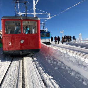 1月だったため山の寒さ、雪が心配でしたが、十分な防寒をしていけば大丈夫でした。雪山を歩くのは山頂の駅から頂上までの20分ほどですが、坂道で凍っているところもあるので滑らないかつ防水の靴がいいです。頂上は風がとても強く、ニット帽も飛ばされそうになるくらいだったので気をつけてください。