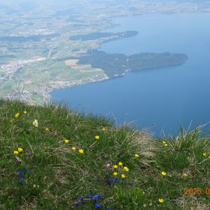 ゆっくり山頂の花や、そこから見尾下すルツェルン湖の景色を楽しんだ後、ホテルで昼食っを食べ、あたりを散策。ハイジの小屋みたいな小さな教会の周りにも黄色い花がいっぱい咲いていて、ところどころに青い花も固まって咲いていた。その花越しに見る下界の景色も最高。