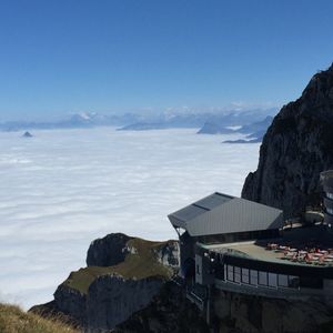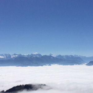 出発した時は曇っていました。ガイドさんが山頂は晴れですよと言っていましたが、ロープウェイ乗り場に着くと今にも雨が降り出しそうでした。ロープウェイに乗ると何も見えなくなり、諦めかけた時、雲を抜けてロープウェイの駅に到着すると何と抜けるような青空が広がっていました。頂上はとても素晴らしい景色でした。雲海の向こうの山々の中からユングフラウヨッホ、アイガー、メイヒを探し、見つけることができました。360°ぐるりと見回しても、感動の景色の連続でした。こんな景色を見られるなんて、参加して本当に良かったと思いました。