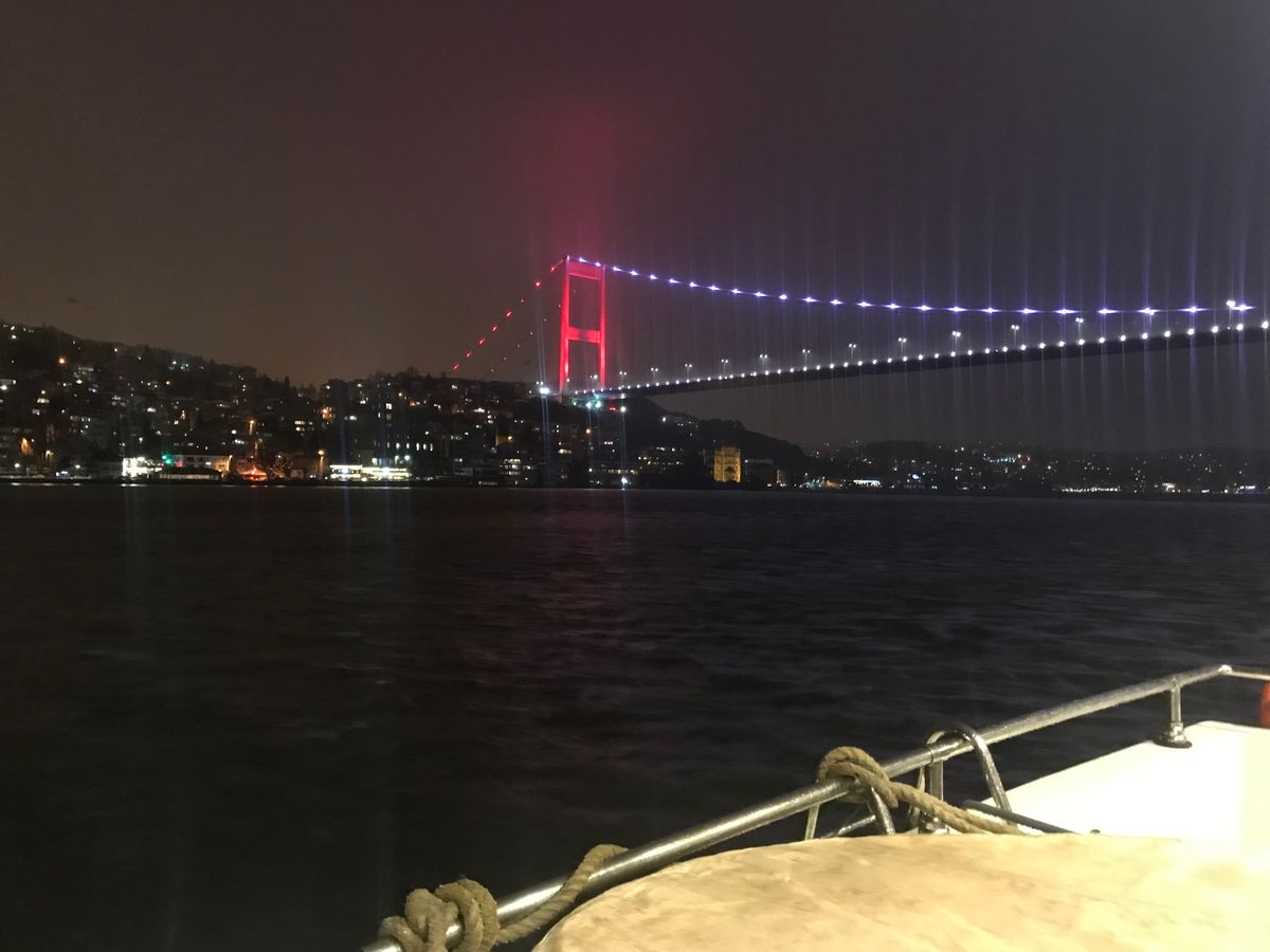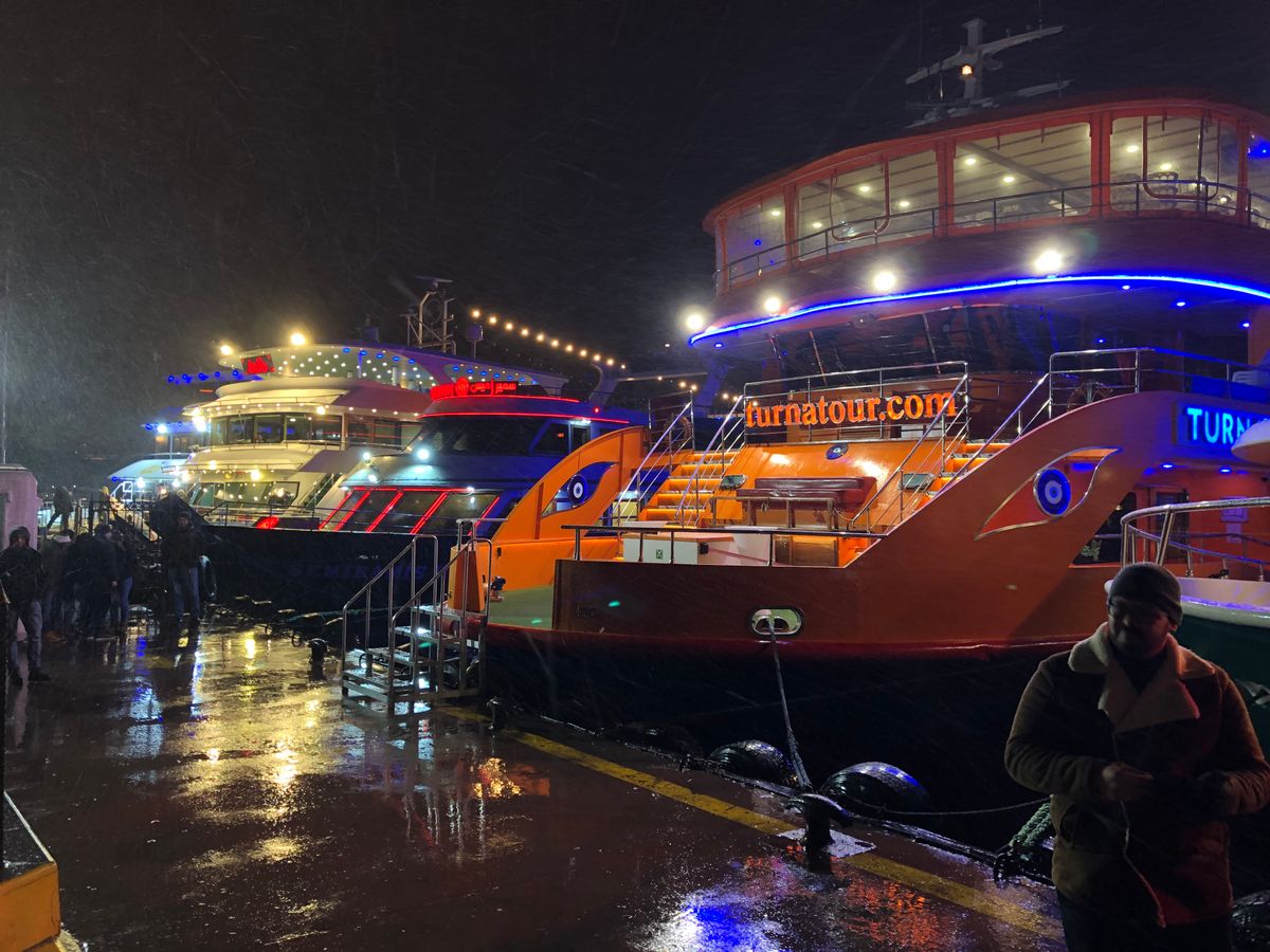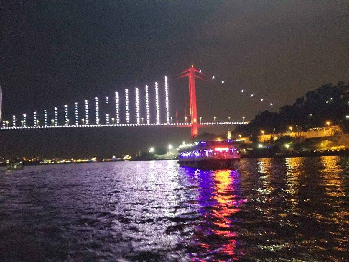 1月1日の元日に行きました。すごく大きい船で、酔うことも無く楽しめます。参加者は各国から集まっており100人はいたと思います。入船すると自分の国の国旗を渡され、席に案内された後はすぐ伝統のトルコ料理が出てきます。本当に伝統料理なので好みは分かれますね。私は嫌いではなかったです。
