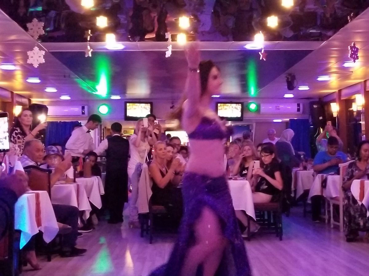 出し物は歌と音楽、舞踊セマーとベリーダンス、あとトルコの伝統舞踊?が見れました。ここまでは、主催者の催しですが、自分達が自国をアピールする謎のダンスタイムの始まり。。各国の有名な単語を叫ばれたあと、前に登場させられ謎のダンスを披露させられます。日本は私達2人だけでしたが、「スズキ、トヨタ、ホンダ、ニッサン〜〜」と叫ばれたあと、何故か日本の曲ではなく、知らない中東の曲に合わせ100人の前で2人が踊り狂うことになります。これはなんだ。。とりあえず盆踊りの振付をしてみましたが、中東のハイテンポに合うはずもなく、わずか20秒ほどの時間は永遠かと思われました。終始クラブの様なウーファーばっちりな爆音海上クラブですので、ノリがキツイ人は船を選んだ方がいいかと(元日だけ?また全部の船がそうではないと思うので)。しかし景色はやはりバッチリですし、一度は乗ってみるといい経験になると思います。