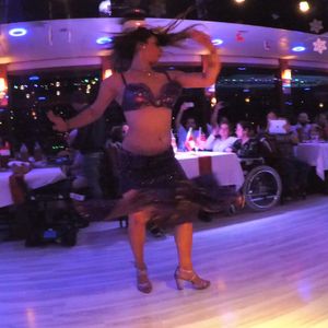 時間通りにホテルに迎えにきてくれました。夜のクルーズは、個人ではハードルが高かったのでありがたかったです。美しい夜景。ただ、もう少し本格的な踊りを期待していましたが、そうでもありません。しかも、いつしか、船上はクラブ、というかディスコのように。延々と続きますが、自分だけ船を降りることはできないので、少し飽きてしまいました。踊る人、踊らない人、色々なのですが、海外の方の表情などを人間観察。比較的、上の年代の方が踊っておられました。眺めているだけで、それはそれで楽しかった。食事は、1人でロカンタで食べるものの方がはるかに美味しかったです。アルコール付にしたところ、ワインはイマイチですが、ビールはまずまずです。ディスコ大会の最中も、マメにドリンクの希望を聞きにきてくれていました。終了後は、来たときと同じ番号の車で送ってくれました。
