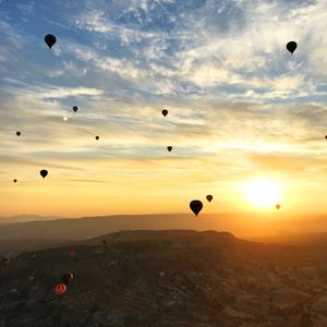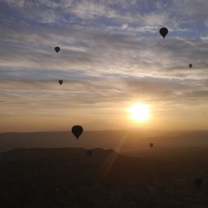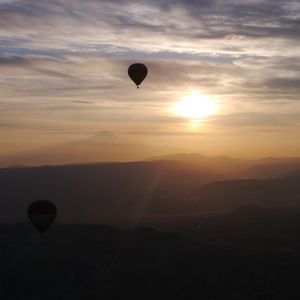 待つ間もドキドキ、そして乗船、最初は低空飛行で地面がすぐそば、なぁーんだっていう感じですが、間もなく上空へ、山の向こうから登る朝陽を浴びながらたくさんの気球の中へ。