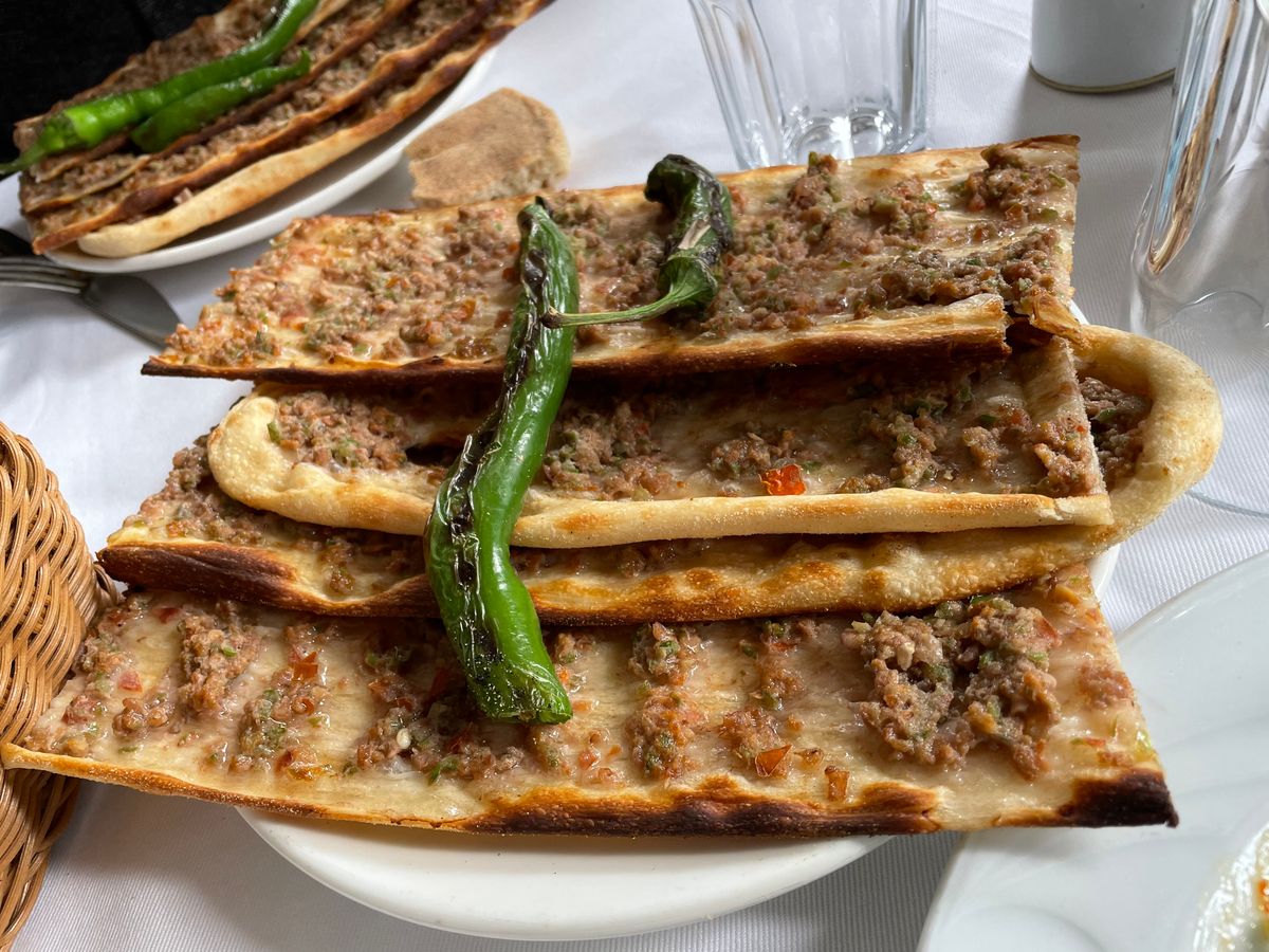 3日目の最後の昼ごはん、私たちはトルコ旅行最終日でそのまま日本へ帰国する予定だったので、遅めにとりたいとのことでパムッカレではない場所で食事をすることになりましたが、なかなかお店が見つかりませんでした。ozdenさんが地元の人に尋ねたりぐるぐると探してくださって、地元のお店でラフマジュン、ココレチをいただくことができました。生地から手作りで大変美味しかったです。空港のご飯は高いからとテイクアウトで夜ご飯もいただきました。
