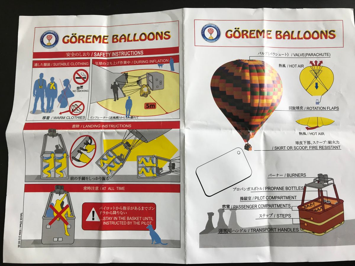 カッパドキアの気球は過去に何度も事故が起きているので信用できるバルーン会社を選ぶことが重要かと思います。その点にも興味があったので景色だけでなくパイロットの動きや地上との通信も見ていましたが、事前説明やパンフレット(写真参照)などがキチンとしていて不安は消えました。