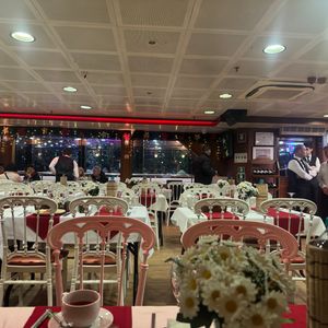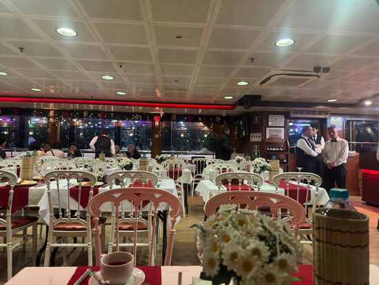 1月1日の元日に行きました。すごく大きい船で、酔うことも無く楽しめます。参加者は各国から集まっており100人はいたと思います。入船すると自分の国の国旗を渡され、席に案内された後はすぐ伝統のトルコ料理が出てきます。本当に伝統料理なので好みは分かれますね。私は嫌いではなかったです。