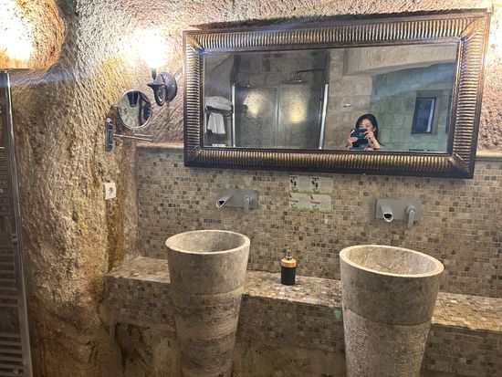 宿泊ホテルが、洞窟ホテルと言う事で、期待していたのですが、シャワーブースが狭く、便座や、トイレットペーパーまでびしょ濡れになってしまいました。照明がかなり暗くてホテル内が残念でした。