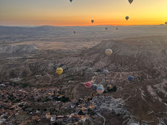 最初の気球チャンスは強風で中止になってしまったのですが、プパトラベル様には手を尽くしていただき、翌日はギョレメで素晴らしいフライトを体験することができました。ものすごい数の色とりどりの気球が、夜明け〜朝日をバックにきのこ岩の上に浮かんでいるのは圧巻です。最終日は、朝早くに気球がよく見えるBaloons Highest view point in Goremeにて高台から気球を見に行きました。