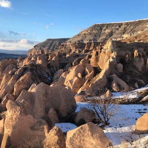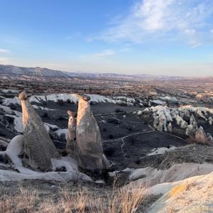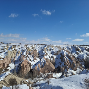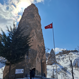 冬の時期は、気球に乗れる確率1/3だそうで、前日の判断で欠航が決まり残念でしたが、逆に奇岩巡りは雪とのコントラストが美しく眺めは最高でした。