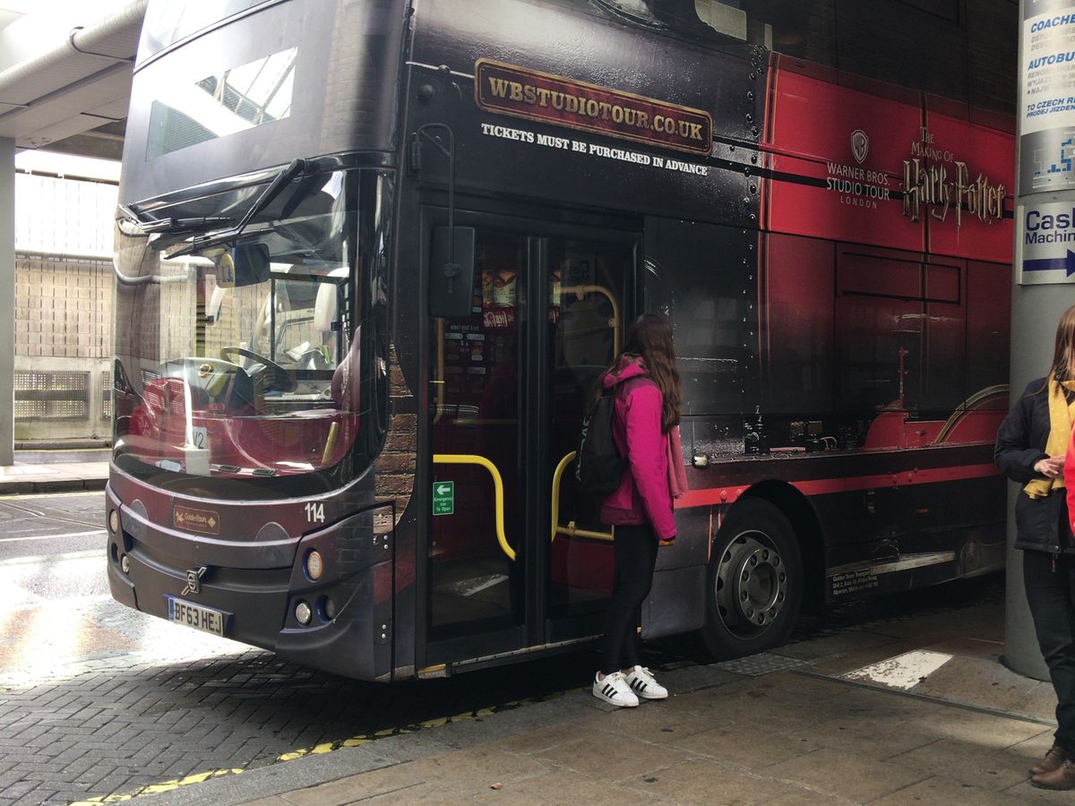 バスの中で「賢者の石」がモニターで上映されていました。各国からきたファンと同乗なので気分が盛り上がります。場所がロンドン中心街から離れていて、雨も降っていたので、連れて行ってもらえてとても楽でした。お勧めです。
