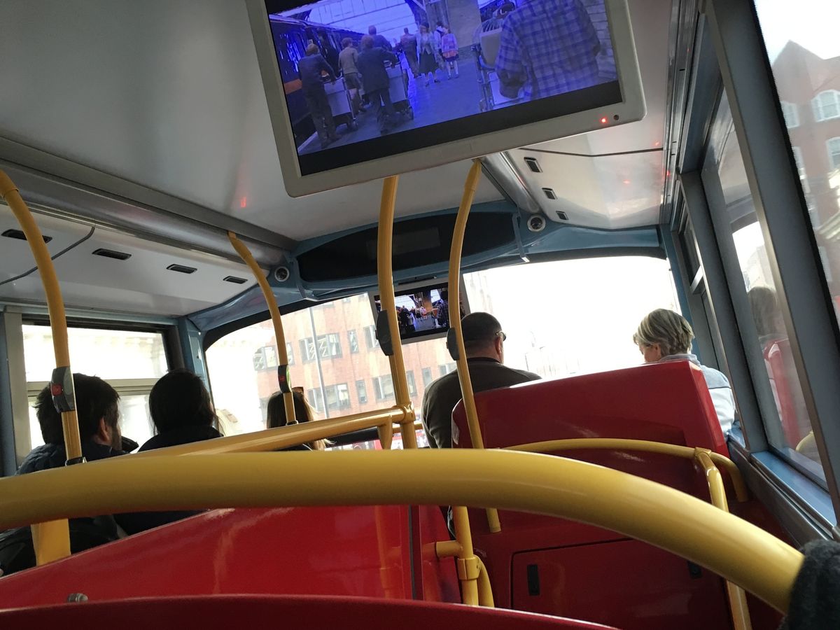 ビクトリア15:00出発で集合は14:30でしたが定刻に集合場所につくとすでに行列ができており、14:45あたりから乗車開始。車内にトイレは無いので、乗り込む前に済ます必要があります。オフィシャルの2階建てバスが来ますが、市内を走っている2階建てバスの座席クッションを少し良くした程度のバスなので、背もたれも低く、特にロンドン市街地を抜けるまでは何度も停止したりブレーキしたりするので長い時間の乗車ははっきり言ってきついです。