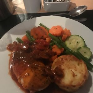 お料理はチキンの胸肉がメインで(サラダチキンのようでした)、付け合わせの野菜、そしてデザートとコーヒーか紅茶でした。