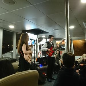 花火をみるポイントに移動するまでは船内ではライブが行われ、川岸の夜景と共に楽しみました。