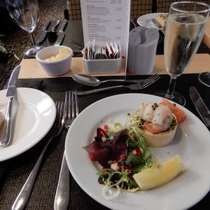 料理は普通に美味しかったです。普通に美味しいというのはロンドンでは貴重です。参加者はみな観光客然とした人ばかりですが、スタッフの対応も慣れたもの。コース料金に飲み物やパン類が入っていないので、多少の追加料金は発生します。プラス£10だったかの窓際確約プランにしましたが空いていたので確約の意味は無かったです。ただ種類限定ながらワインがグラスでたっぷり3杯付くので飲む方はお得です。