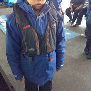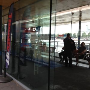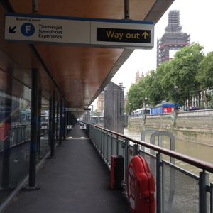 それぞれのクルーズ船によって乗船ポイントが違うのですが、このテムズジェットは乗船ポイント「F」を目指します。そこの待合室で全員そろうのを待ったあと、安全説明やライフジャケット着用をして、乗り場に移動します。