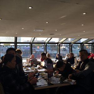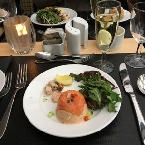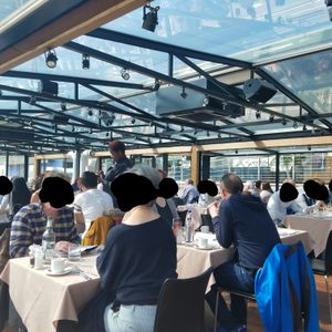 集合場所は地下鉄の駅を降りてすぐにわかりました。席も決まっていたので、スムーズに案内されました。窓際ではなかったですが、景色はよく観えました。アジア人は私たちだけでしたし、言葉もわからず緊張しましたが、メニューもゆっくり選ばせてくれ、ちゃんと注文できました。船乗員さんはイケメンばかりで、店内ではジャズの演奏もあり、オシャレな空間でした。食事もおいしかったです。ただ、スローペースで出てくるので、物足りなさも若干。。。最後に誕生日ですか?記念日ですか?と聞かれ、どっちでもなかったのでNOと答えたのですが…YESと答えた方に花火のサプライズがありました。YESと言っておけばよかったなぁ(笑)