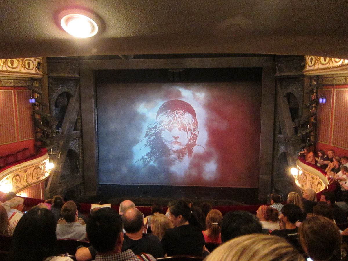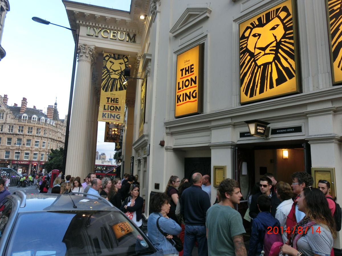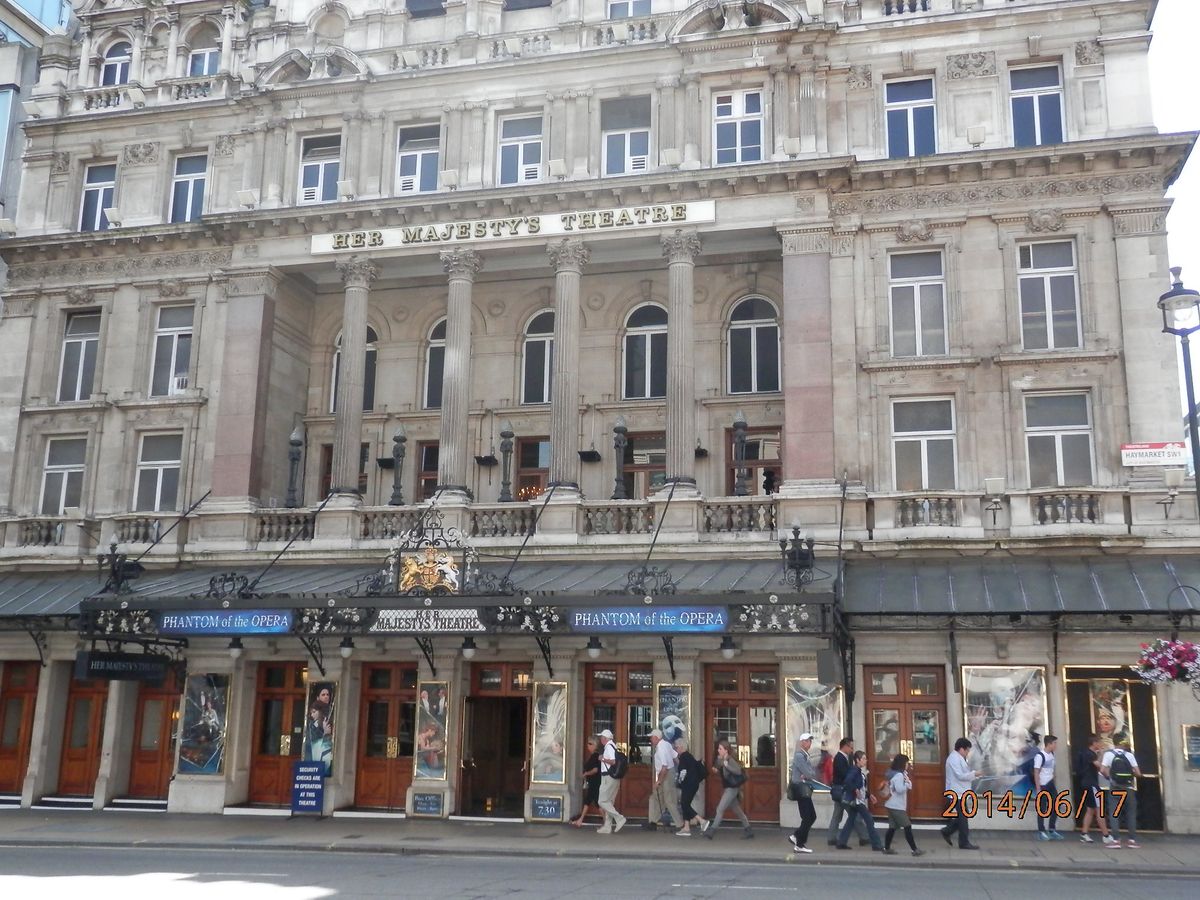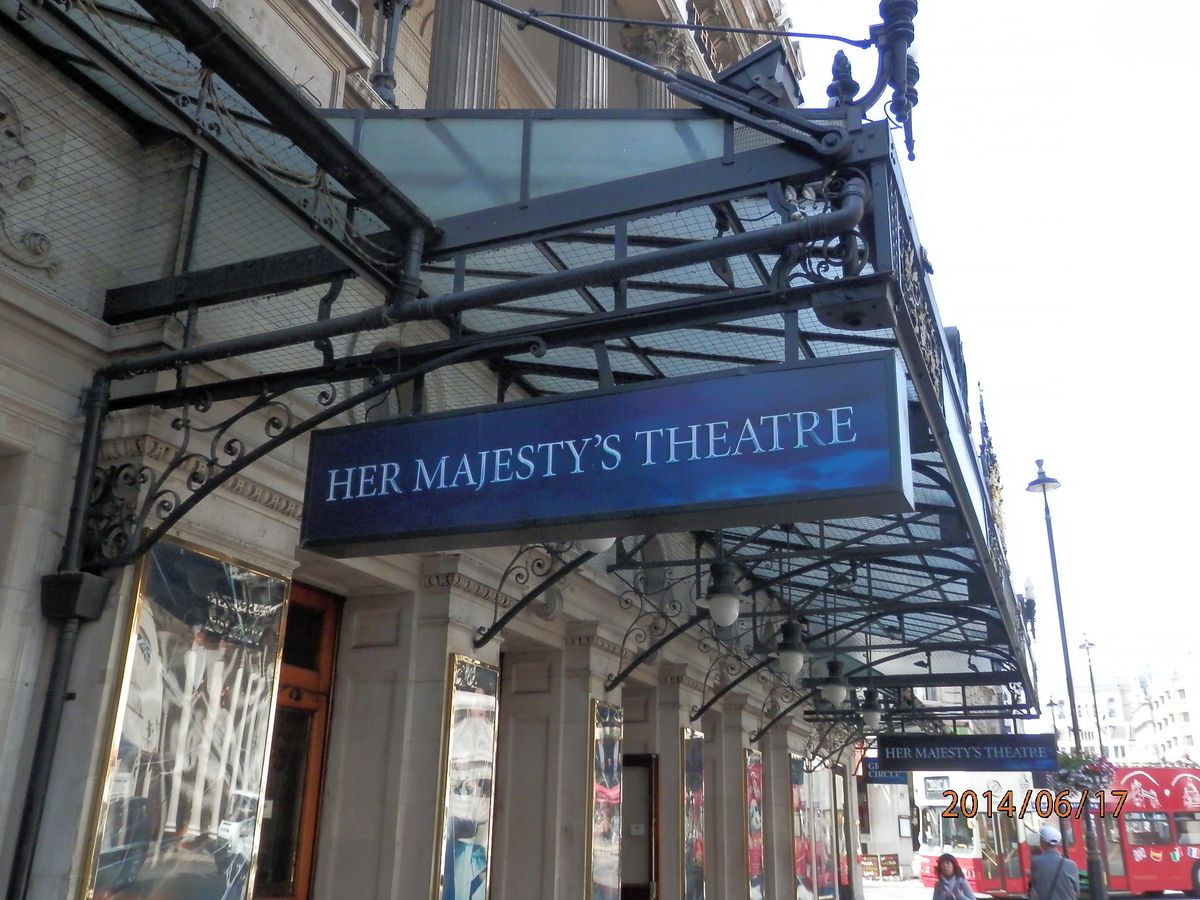 2014年7月4日ロンドン市内観光夕食後 19:10いよいよクイーンズシアター到着。25年前から海外出張で横目に眺めていた憧れのあの看板の劇場についに入った! 客席はほぼ満席。今か今かと公演開始を待ち、繰り広げられる舞台に圧倒された。英語の歌詞、セリフは完全には理解できないものの良く知ったストーリー問題無し。言葉を超えた舞台の歌、演技に圧倒され涙が抑えきれませんでした。会場はどんどん盛り上がり拍手の嵐、最後はスタンディング・オベーションで3時間の至福の時間が終了。本当に幸せなひと時でした。幕間に他の観客と国際親善、感動を分かち合うのも楽しい時間でした。世界は一つ、最高!