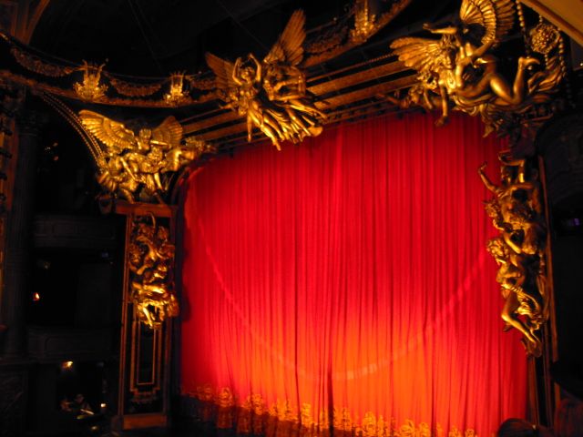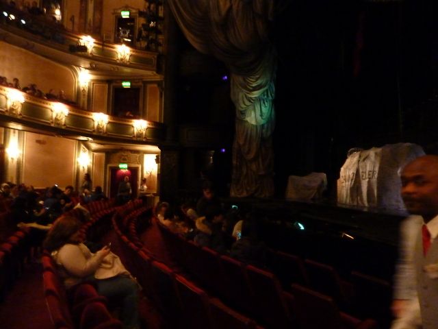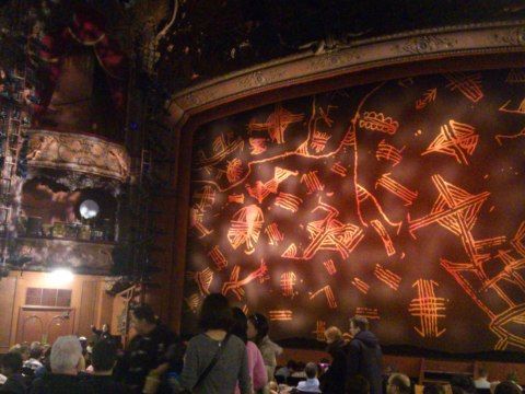 小さな劇場でしたが古くて重厚な内装で始まるまで天井や周囲を眺めていましたが、舞台中央上の大きなエンジェルの彫刻?も劇場の装飾だとばかり思っていたのが、あとで大道具の一つと分かりビックリ!他にも地下に下りて行く階段や、地下を流れる川の表現、中でも舞台から客席中央の天井まで吊り上げられる大きなシャンデリアの仕掛けに感心しました。
