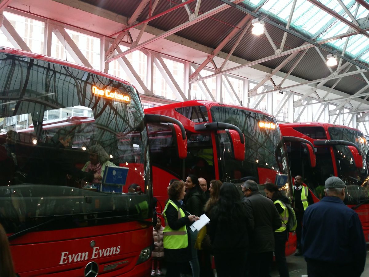 ビクトリア駅から集合場所のビクトリア・コーチステーションまでは、どの改札からもコーチステーション方向を示す表示があります。コーチステーションまでの道順を、集合場所案内にある写真や、ストリートビューなどで事前に確認しておけば、問題なくたどり着けます。チェックイン時に指示される番号の出発口の前で待ちますが、ひとつの出発口を複数のバスが使用するので、表示板に違うバスの表示も出ます。予定時刻近くになれば乗るべきバスの案内が出るので安心してください。コーチステーションでのトイレはバス乗り場が並ぶ場所の地下にあり、有料ですが、係員が複数人いて両替もしてくれます。