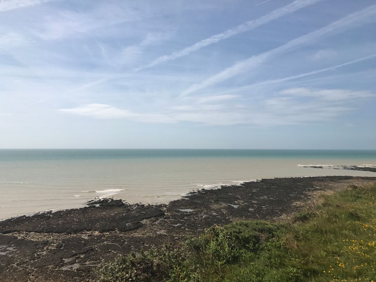 素晴らしい天気に恵まれ、羊たちを横目に見ながらのんびりと歩き、ついに真っ白な巨大いな崖と対面。途中ウサギも目撃。