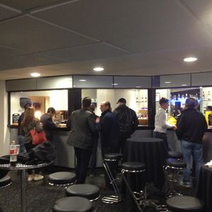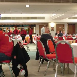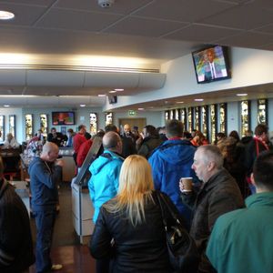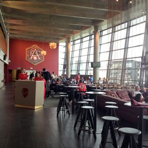 チケット交換後、徒歩5分くらいの距離にあるExective用エントランスから入り、座席があるフロアまで上がり、上がってすぐ側のクロークでチケットを見せるとパンフレットとコーヒーを貰えます(言わないとくれないので注意です!私たちは後で貰いに行きました。)その後、試合を待つ間ラウンジが利用でき、有料ですがラウンジ内のバーやレストラン(ビュッフェ)も利用できます。(早めに行かないと開始45分前くらいには満席になります)ラウンジは座席と繋がって便利ですし、ラウンジ内にお手洗いもあり、一般席のような行列を味わうことがありません。ハーフタイムも試合後もラウンジ内でコーヒーと紅茶が配られます。