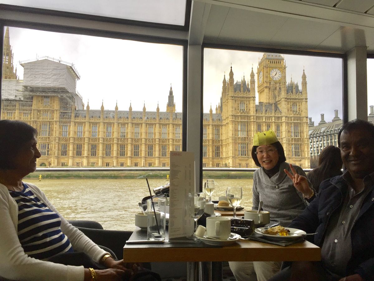 夕方ロンドンヒースロー空港に着いてそのまま参加、家族3人でJazzの生演奏を聴きながらテムズ川をクルージング。ライトアップされたビッグベン、ロンドンアイ、ロンドンブリッジ、ロンドン塔を眺めとても日本人にも美味しい食事でした。