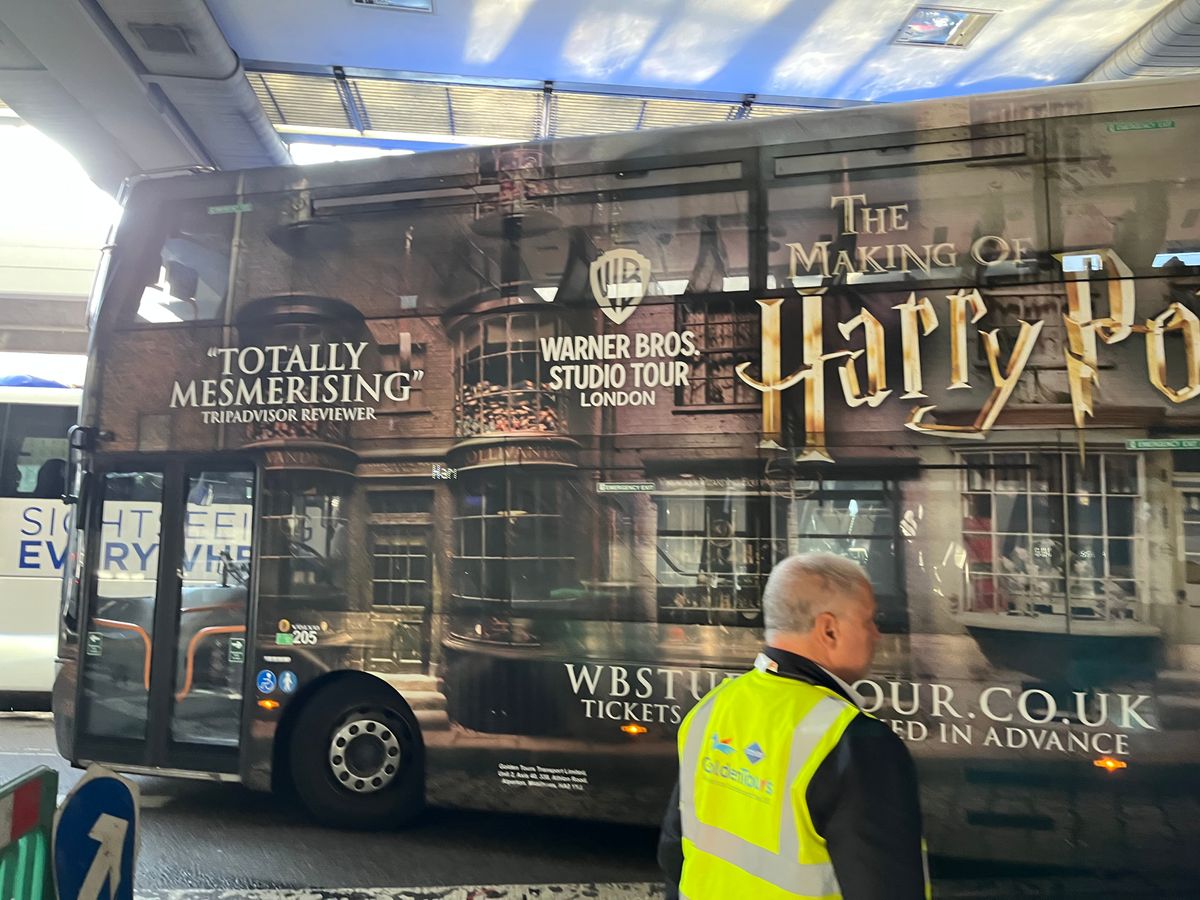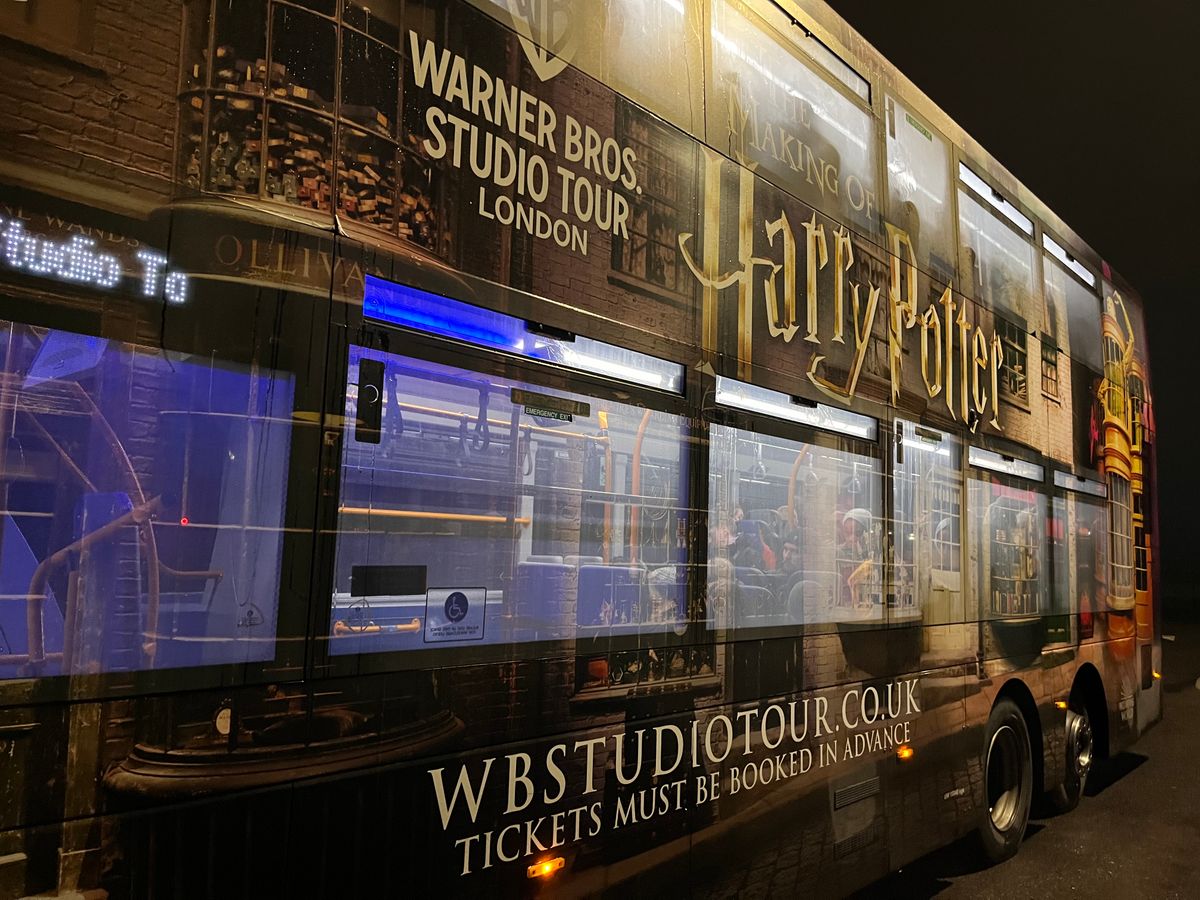 キングスクロス駅からのツアーに申し込みました。約1時間ぐらいで到着しましたが、かなり揺れを感じたので車酔いをしてしまいました。酔いやすい人は酔い止めがあると安心です。到着後、リストバンドと入場券を手渡され、帰りのバスの時間までに戻ってきてねと言われて、自由行動になります。スタジオに入ってからは、まず椅子に座って映像を見る部屋があるので少し並びます。スタンプラリーができる冊子があるので、いいお土産になりますし、7つのスタンプを集めながら回るのがオススメです。4時間の滞在で全て見て回れるか不安でしたが、最後にお土産をゆっくり見られるぐらい大丈夫でした。途中で食事ができるところもありますが、見て回れるかの不安と、車酔いの不安もあったので、食事はしませんでした。バタービールを飲んでいる人が多かったです。容器は洗って持って帰れるようです。帰りのバスが時間通りに来ず、寒い中待って、結局同じツアー会社のビクトリア駅行きのバスに乗せてもらいました。バスで連れて行ってくれるので、とても楽でした。