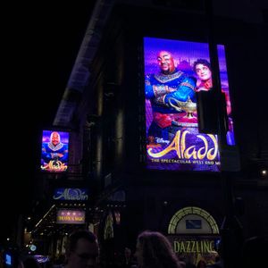 アラジン夜公演、学生の娘と行きました。地下鉄降りると周りは劇場だらけでしたが駅前の地図を見て迷うことなく到着しました。アラジンは英語に自信がない私達でも十分楽しめました。小さい子供連れの家族もたくさんいて、カジュアルな服装でも全く問題なさそうです。席はなんと前から4列目のセンター。演者の方々と何回も目が合う席でした。歌唱力は素晴らしいし、とにかくステージ全体が華やか。仕掛けもすごかったです。観終わると幸せな気持ちになりました。帰り時間は10時前だったので少し心配していましたが、各劇場の終わり時間も重なり昼間と同じような人混みで問題ありませんでした。