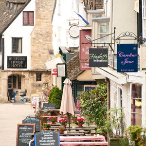 はちみつ色の石造りの家並みが17世紀頃までの姿そのままに残されているバーフォード。坂道のハイ・ストリート沿いには可愛らしい骨董品屋やカフェが立ち並び、ウィンドウショッピングだけでも気分が上がること間違いなし。