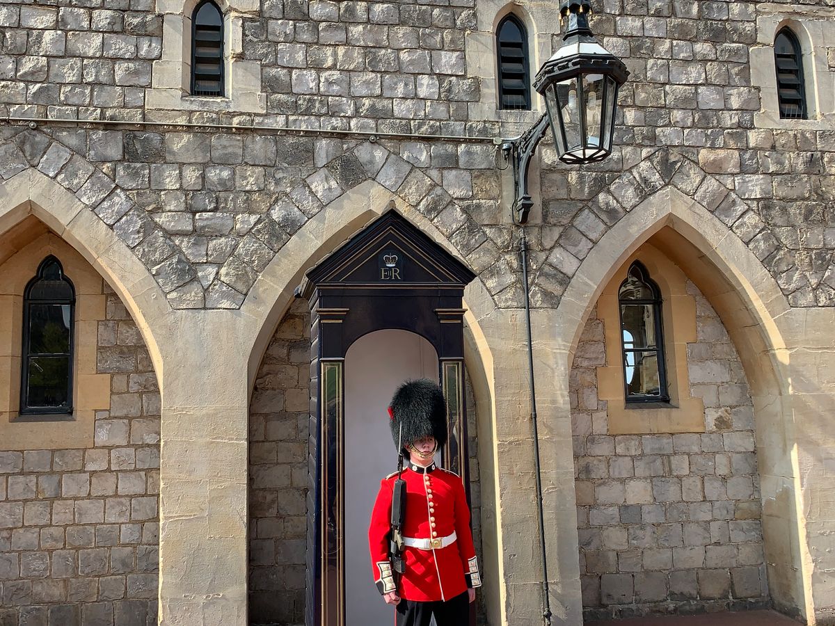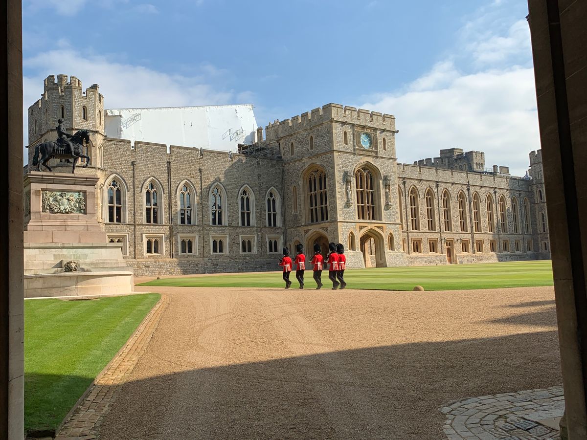 まずはウインザー城見学、入場時間前に到着したため鳴海さんお勧めの撮影ポイントに案内され国王の入場門で撮影タイム。その後、城内見学1時間程度。