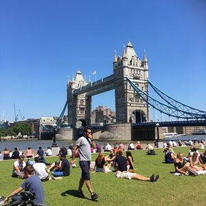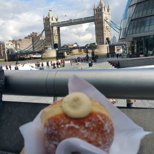 その後は、タワーブリッジ方面に向かい散策しながら、世界最古といわれるミードという発酵酒、ソーセージロール、クリーム入りドーナツを味わいます。この辺りはテムズ川沿いの気持ちのいい散策コースになっています。途中でタワーブリッジをバックに写真を撮ることもできました。