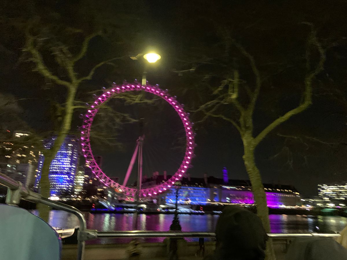 バスを待つ間はそれほど寒くなかったので、オープントップ最後尾の座席に乗り込みました。イギリスのライトアップされた街並みは本当に美しくて、写真撮りまくりでしたが、後半、特に川のそばや、橋の上に差し掛かるたび冷たい風がビュービュー吹きつけ凍りました。ダウンは着ていたのですが特に足元も寒いので、カイロや膝掛けがあるといいかもです。一応有名どころは回れるのでイギリス到着日に参加して正解でした😊
