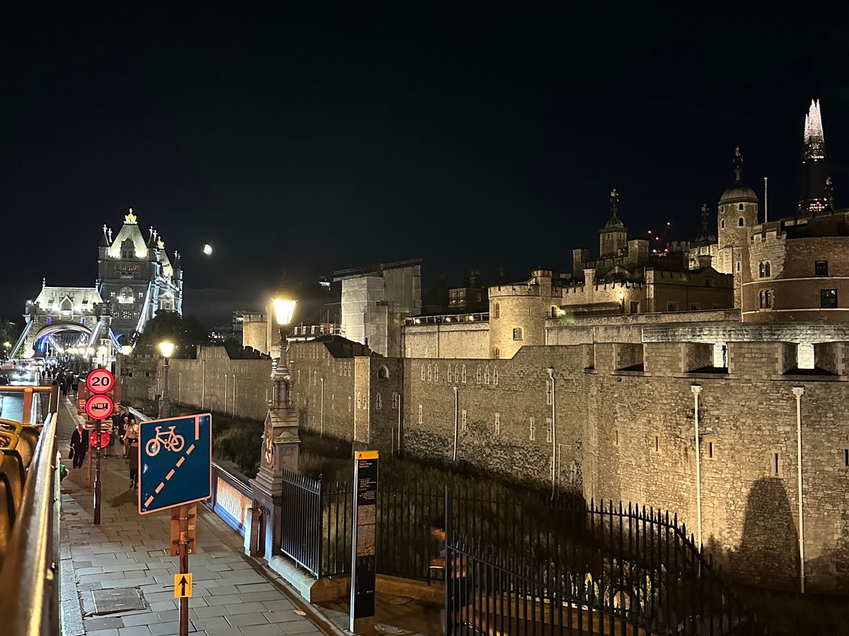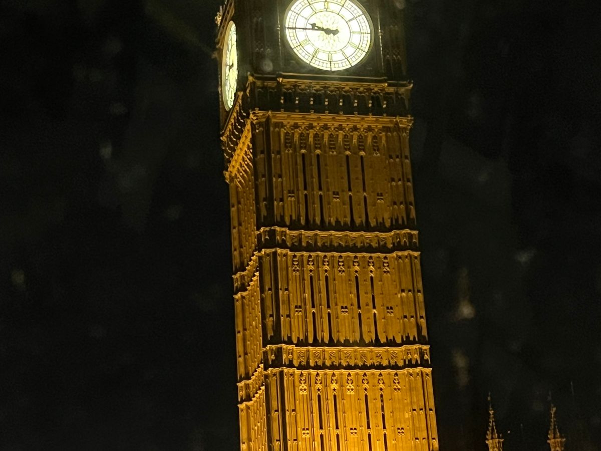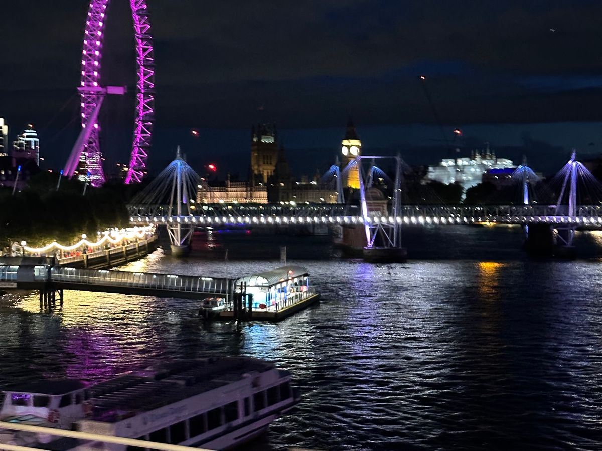 ロンドン到着の初日にディナーも兼ねてロンドン市内をバスで観光できるという事で申し込みました。コヴェント・ガーデンのホテルに宿泊していたので、集合・解散も徒歩で行けてとても便利でした。2階建てバスの2階部分がレストランのようになっていて、グラスに注いだ飲み物が車体の揺れでこぼれない様に固定できる器具がテーブルについています。バスが動き始めて、最初にロンドン塔、タワーブリッジが見えた時はテンションが上がりました。タワーブリッジをバスで通過して進んでいき、市内の名所を廻ります。この日は残念ながら雨模様で、名所を綺麗に撮影出来なかったのは残念でした。バスの屋根は透明で景色は見やすいですが、雨で濡れると綺麗に見えない所もあります。