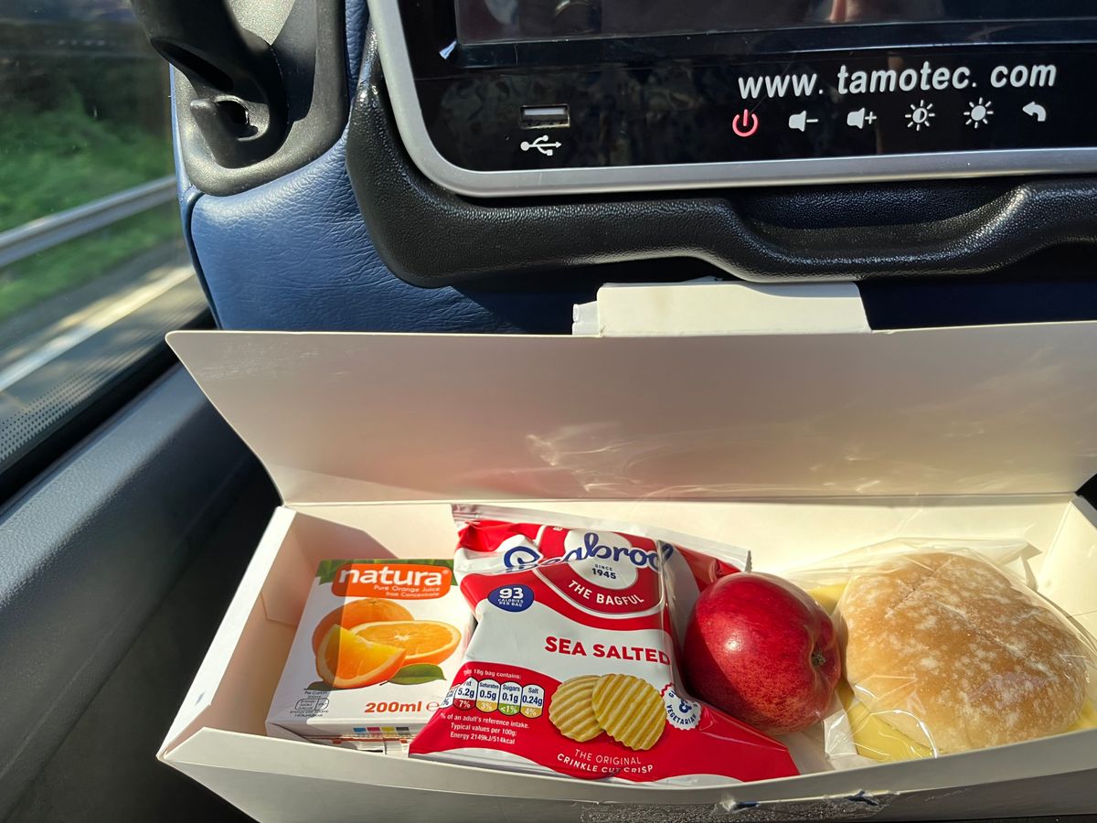 -ジュース、お菓子、小さいリンゴなどが入った軽食ボックスを一人一箱無料でいただけました