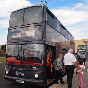 集合時間にゴールデンツアーの前にハリーポッター行きの看板がありそこに並んでると定時刻ぐらいにハリーポッター専用の2階建てバスがやってきて連れてってくれます!!