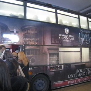 集合場所がわかりづらいのではと少々不安に思いつつ向かってみると、とてもわかりやすいところにありました。ハリー・ポッタースタジオツアーの看板の前に並び、時間になるとスタッフがバスに案内してくれました。この時、帰りのバスの時刻の案内が印刷されたものをくれます。まず全面にHarry Potterのロゴと写真がプリントされた2階建てバスでテンションがあがります。バスに揺られて1時間ほど、ワーナーブラザーズスタジオに到着です。ドライバーが一組づつチケットを渡してくれます。後は帰りの集合時間まで好きに過ごして良いのですが、有料のデジタルガイドを借りる場合はエントランスに並ぶ前に借りられます。ここにスターバックスがあって、軽食をとったりコーヒーを飲んだりできます。少し並ぶと一度に50人くらいが中に入れられ、スタッフの説明があって(ディズニーランドのホーンテッドマンションのような感じ)、少しの間映像を見せられ、また別のスタッフが案内、説明を始めました。全部英語でしたので、私にはちょっと厳しかったです。