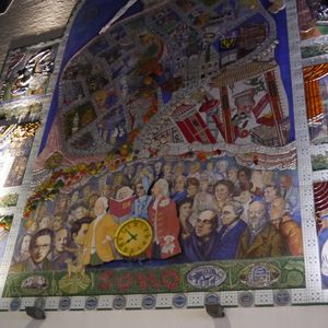 ナイトウォークはガイドさんの案内にて界隈を散策です。背広の語源となったといわれるサヴィル・ロウ、ソーホー地区全体が描かれた壁画、昔コレラの感染原因となったブロード・ストリートの井戸、ピンク街、ゲイ街などを回りました。