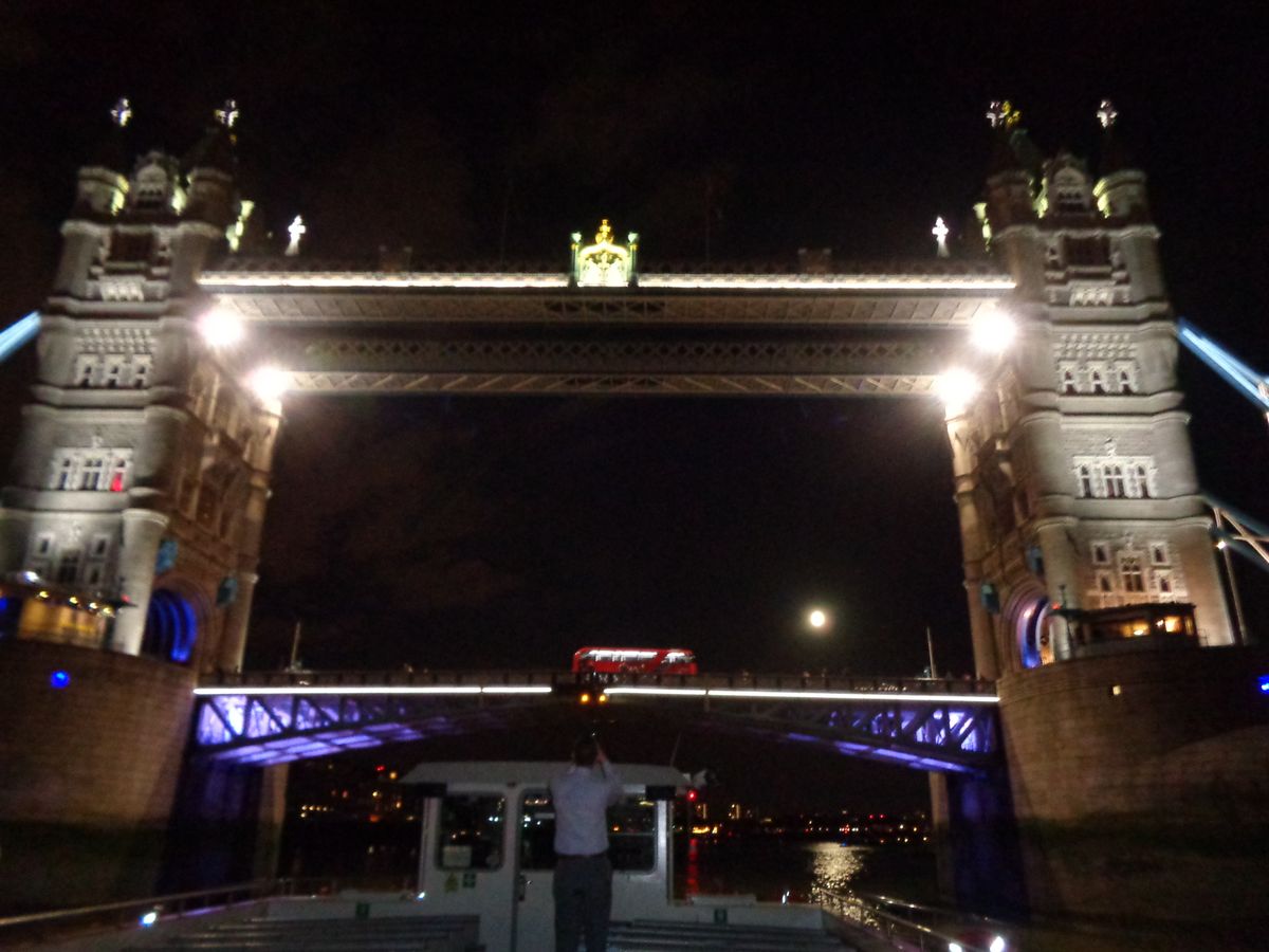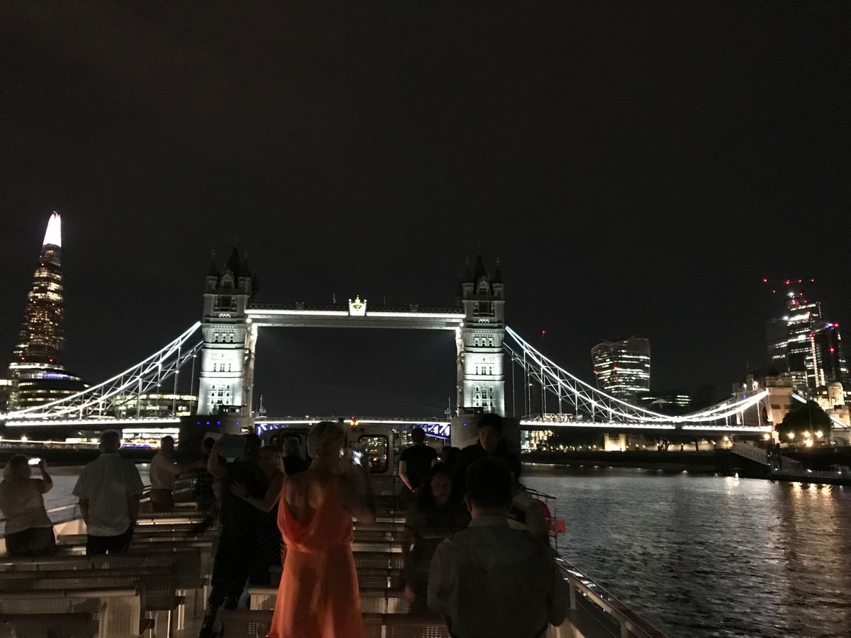 乗船場から19:45出発時点はまだ明るく、ウェストミンスター国会議事堂から、ロンドンオリンピックの会場近くまで下ったころには日が暮れ、川を上りながらのタワーブリッジ越しのロンドンの夜景は素晴らしかった。