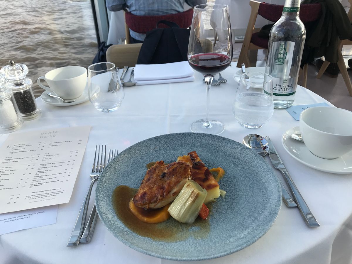 料理は普通に美味しかったです。普通に美味しいというのはロンドンでは貴重です。参加者はみな観光客然とした人ばかりですが、スタッフの対応も慣れたもの。コース料金に飲み物やパン類が入っていないので、多少の追加料金は発生します。プラス£10だったかの窓際確約プランにしましたが空いていたので確約の意味は無かったです。ただ種類限定ながらワインがグラスでたっぷり3杯付くので飲む方はお得です。