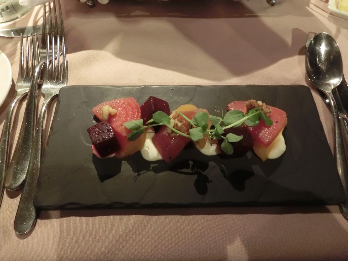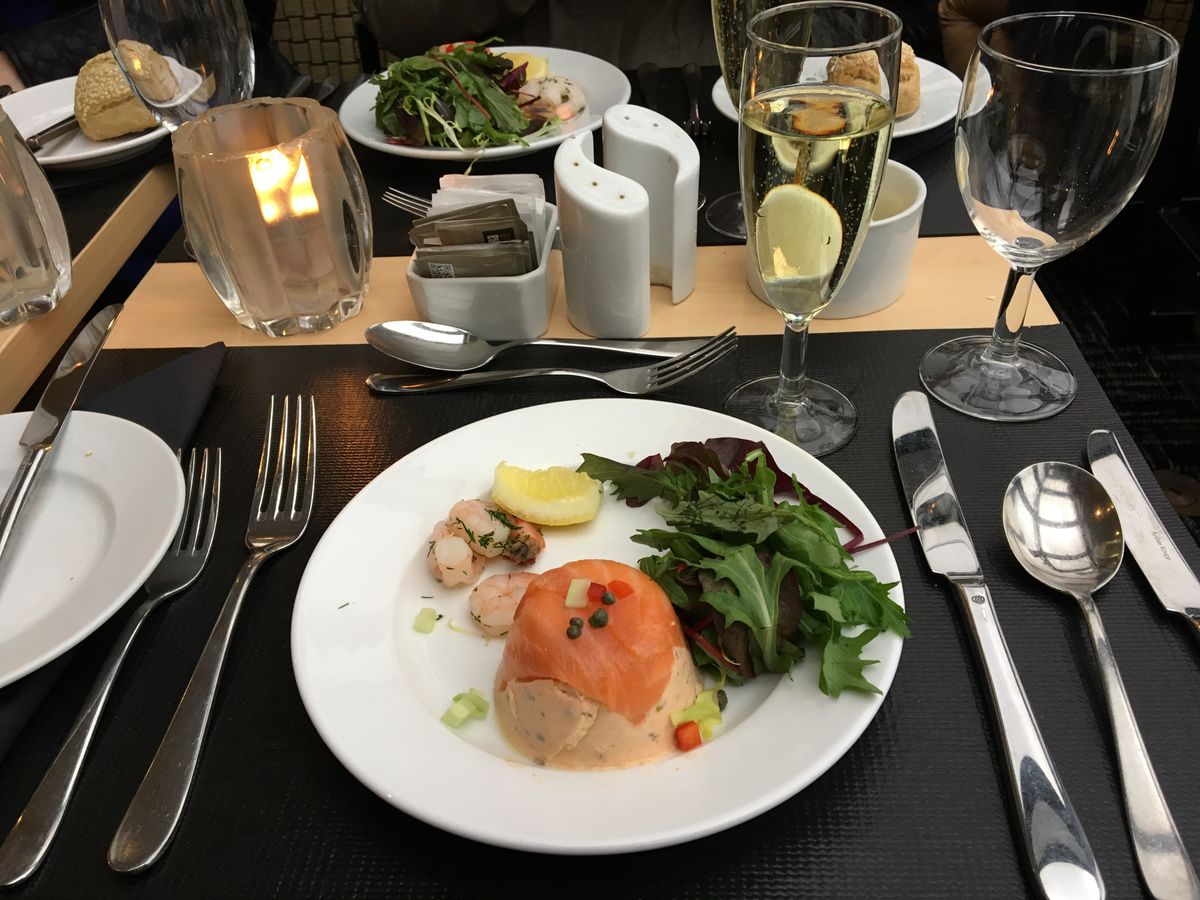 食事は出てくるのがゆっくりで、隣の米国人夫妻も「お腹が空いた。食事はまだ出てこないのかしら。」とブツブツ言っていました。ゆっくり出てきた食事は正直そんなに美味しい訳ではありませんでしたが、イギリス人が頑張って美味しくしようとしてる努力が垣間見れる食事でした。