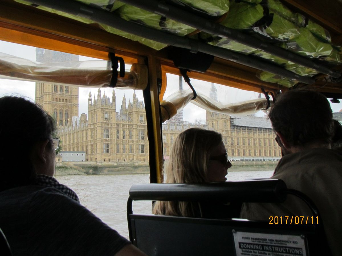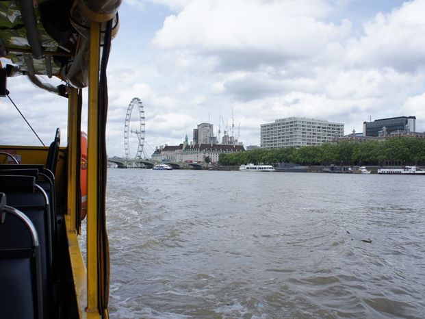 ロンドン観光とテムズ川クルーズを1時間半ほどかけて回りますが、バッキンガム宮殿などは建物の横を通るだけで広場側の真っ正面から見られず、えっ?!今の?どれがバッキンガム?という消化不良が残るかも。テムズ川クルーズは水陸両用車ということで水面ぎりぎり見ながらゆっくり進みます。映画007/スカイフォールでロケ地となったMI6本部建物の横からテムズ川に入水しロンドンアイ手前でUターンして帰ってきます。車(陸上)と船(水上)で運転手が交代し、クルーズ中はガイドは無く、陸上の間は女性ガイドが町並みを英語で説明してくれます。観光というよりちょっとしたアトラクションまたはロンドンの町並みを眺めるという気持ちで参加すると楽しめると思います。バッキンガム宮殿など観光客の多い区域では私たちの乗るダックバスが珍しいせいか観光客から写真を撮られたりしました。