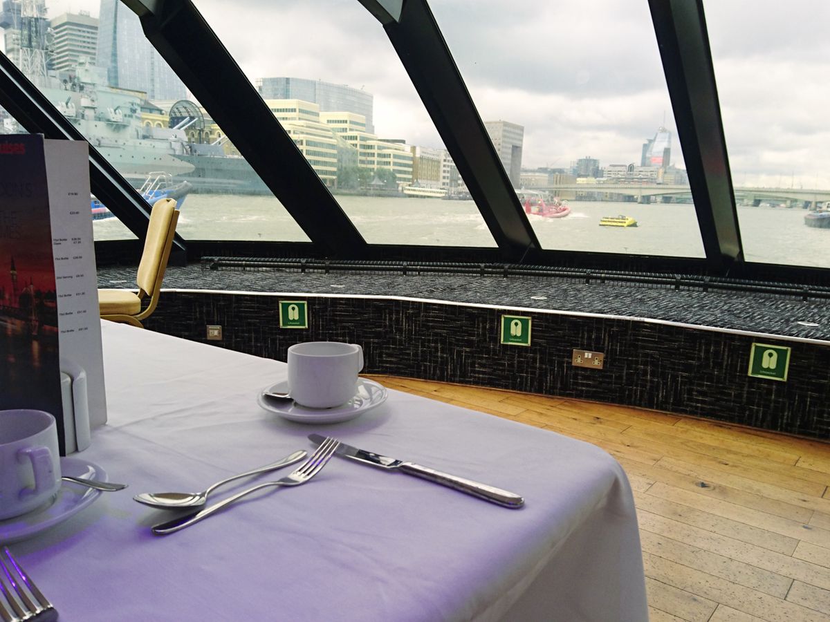 あいにくの氷雨と強風の中、待合室もなく、桟橋で待たされました。船の中は座席も少なく、ゆったりとしていました。トイレもとても綺麗でした。私は肉が苦手なので、ベジタブルコースを選びましたが、少し塩辛いと思いました。クルーズは観光地のある方はビッグベン辺りで折り返し、タワーブリッジを少し越えた辺りから、住宅街でした。晴れていたらもっと素敵に思えたでしょう。