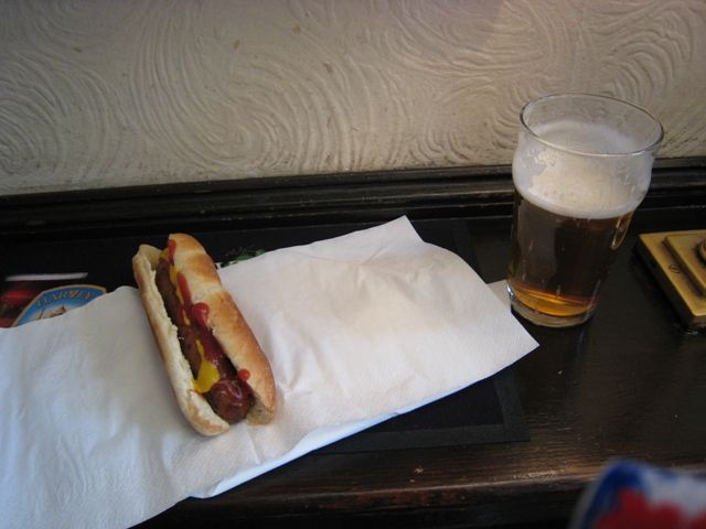 宮殿を後にした我々はロンドン市内の中心的な広場のトラファルガー広場近くに、ガイドさんお勧めビールとホットドッグが美味しいイングリッシュパブに行きました。値段もビールとホットドッグで1人6£程で軽い昼食と休憩になりました。