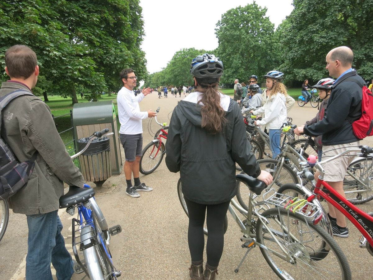 自転車観光してみたいと思い、一人で参加しました。まずQueensway駅をでました、Fat Tireサインは店の看板だと思っていたので周辺をうろちょろ、集合時間になりまだ見つからず焦って駅に戻ってみるとFat Tire看板を持った赤いTシャツの男性が!!これか(笑)集合はオンタイムで大丈夫、寧ろ時間通りに来たのは私ともう一組のみでした。それからFat Tireの事務所へ。歩いてすぐです。自分の好きなギア付きの自転車を選んで、いざ出発!私の時は2グループの総勢18名でした。案内人のグレッグさん、大多数がフランス人、中東系の方もいらっしゃいましたがアジア人は私だけでした。お一人様、家族、夫婦、カップルと様々。ロンドンは自転車専用レーンが設けられていたり、押して歩かないといけなかったり、青信号の時間がびっくりするほど短かったり、ちょっとしたルールなんかも教えてもらいつつ観光しました。逐一指示してくれるので安全。でもあまり自転車なれしていらっしゃらない方だと車の横を通るとかはやはり怖いかも。走行中に転ぶことはないと思いますが(タイヤも日本より太め)、乗る時に転んだ方がいらっしゃいました。足を高くあげて跨がないといけないタイプなのでそこが少々我々には難かもしれません。出発後Hyde Parkへ、リトルモンスターに気をつけてと言われました。周りが見えない子供たちが大勢いるので(笑)公園の中を自転車で走るのは本当に爽快でした!公園の中には日向ぼっこしてる人たちがたくさんいます、これがロンドンかという感じ。まずKensington Palaceへ。その後公園を抜けWellington Archへ、銅像の秘話を聞いてからアーチを抜けてGreen Park側へ。次はバッキンガム宮殿。自転車だとスイスイ行けるので不思議な気分。The Mallを通ってTrafalgar Square。複雑な横断歩道を渡って戻り、ここから時系列がバラバラかもしれませんがHorse Guardsを見て、St.James's Park、Westminster寺院、ビッグベンを見に行きました。途中でSt.James's Parkの池の側のカフェで休憩。20分休憩なので何か買って飲むも良し、ぶらぶら散歩するも良しです。もう一つのグループは違う場所(BARかな?)でビールで乾杯してるのを見かけました。あっちではアルコールOKなんですよね(笑)最後雨が少し降ってきて帰るかまだもうちょいやるか話し合いましたが早足で観光することに。無事に事務所に戻り解散!Fat TireのTシャツを買ってる人が多かったです。パパッと有名どころを回りたいという人にはおすすめです。このツアーでざっと見てから行きたい場所を選ぶも良いですし。でも少し物足りなかったのはビッグベンを木の間からしか見れなかったこと。回ってじっくりみたかっです。総まとめとしては英語できなくても全く大丈夫です。説明が分かればもっと面白いのはもちろんですが、私は半分も理解できていませんでしたが満足しています。案内人の方たちも凄く気さくで優しく面白く、他の方達が質問すれば熱心に答えていました。なんといっても自転車というのがこのツアーの強みですね、とても楽しかったです。違ったロンドンが味わえると思います。