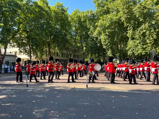 バッキンガム宮殿前 衛兵行進が始まるスポットで待機、楽器隊の出発を観覧