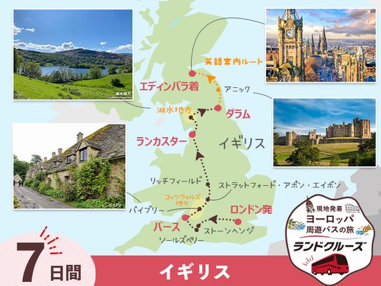 ロンドン→ストーンヘンジ→ソールズベリー→バース→バイブリー→ストラットフォード・アポン・エイボン→リッチフィールド→ランカスター→湖水地方→ダラム→アニック→エディンバラ