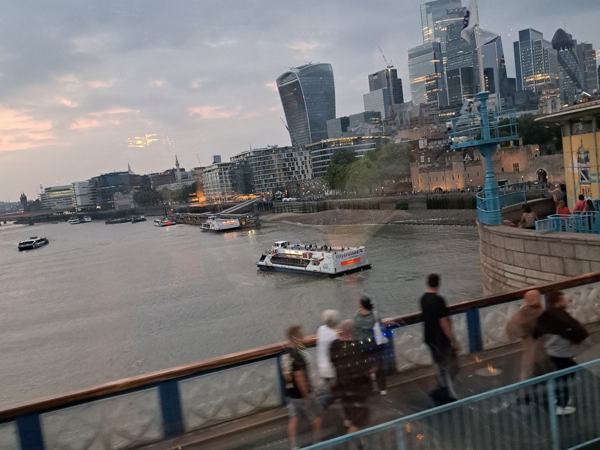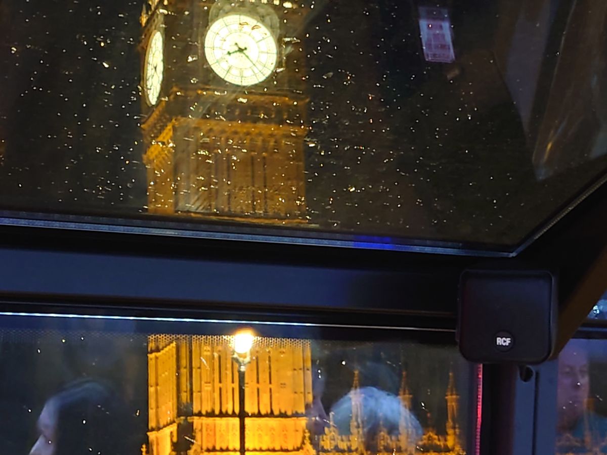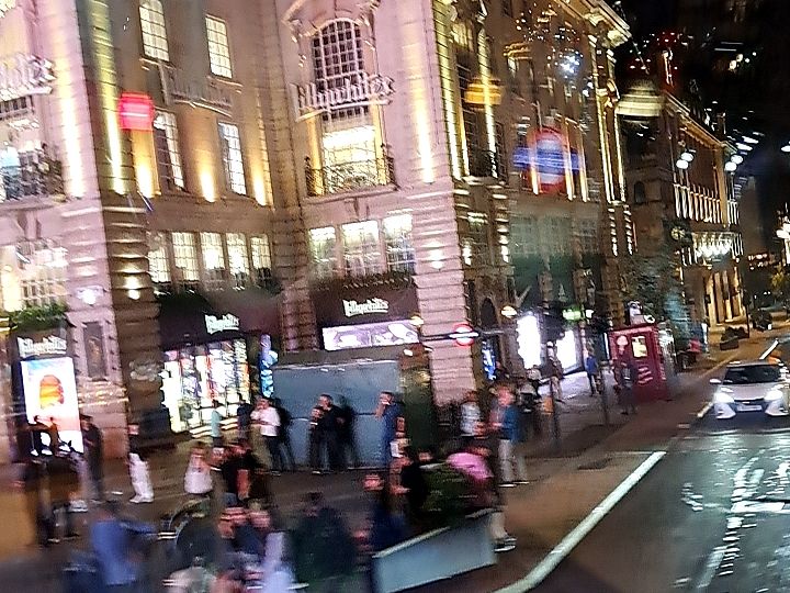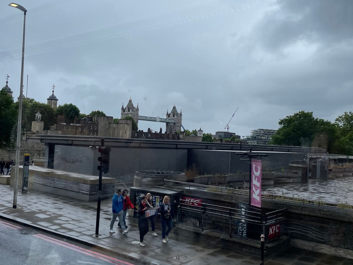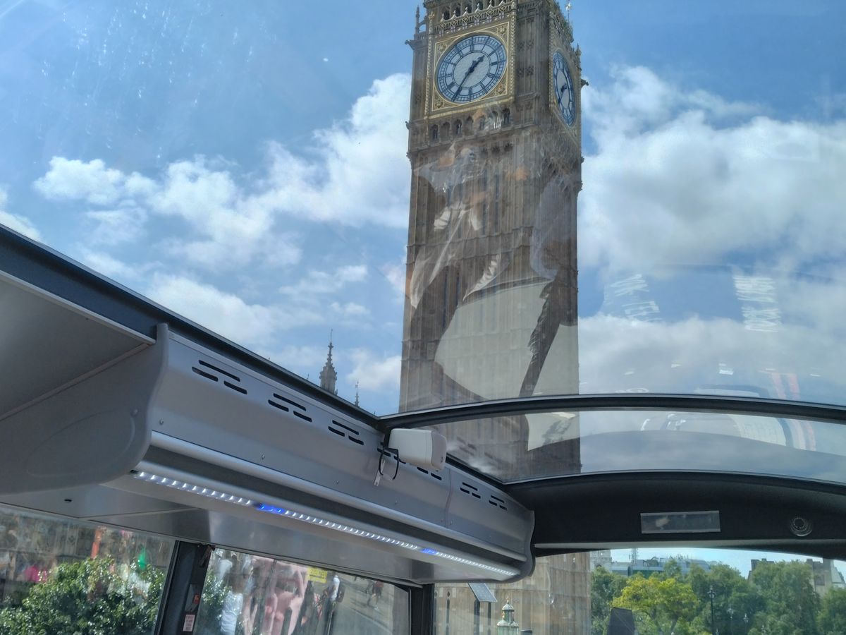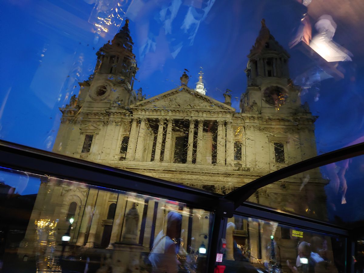 ロンドン到着の初日にディナーも兼ねてロンドン市内をバスで観光できるという事で申し込みました。コヴェント・ガーデンのホテルに宿泊していたので、集合・解散も徒歩で行けてとても便利でした。2階建てバスの2階部分がレストランのようになっていて、グラスに注いだ飲み物が車体の揺れでこぼれない様に固定できる器具がテーブルについています。バスが動き始めて、最初にロンドン塔、タワーブリッジが見えた時はテンションが上がりました。タワーブリッジをバスで通過して進んでいき、市内の名所を廻ります。この日は残念ながら雨模様で、名所を綺麗に撮影出来なかったのは残念でした。バスの屋根は透明で景色は見やすいですが、雨で濡れると綺麗に見えない所もあります。